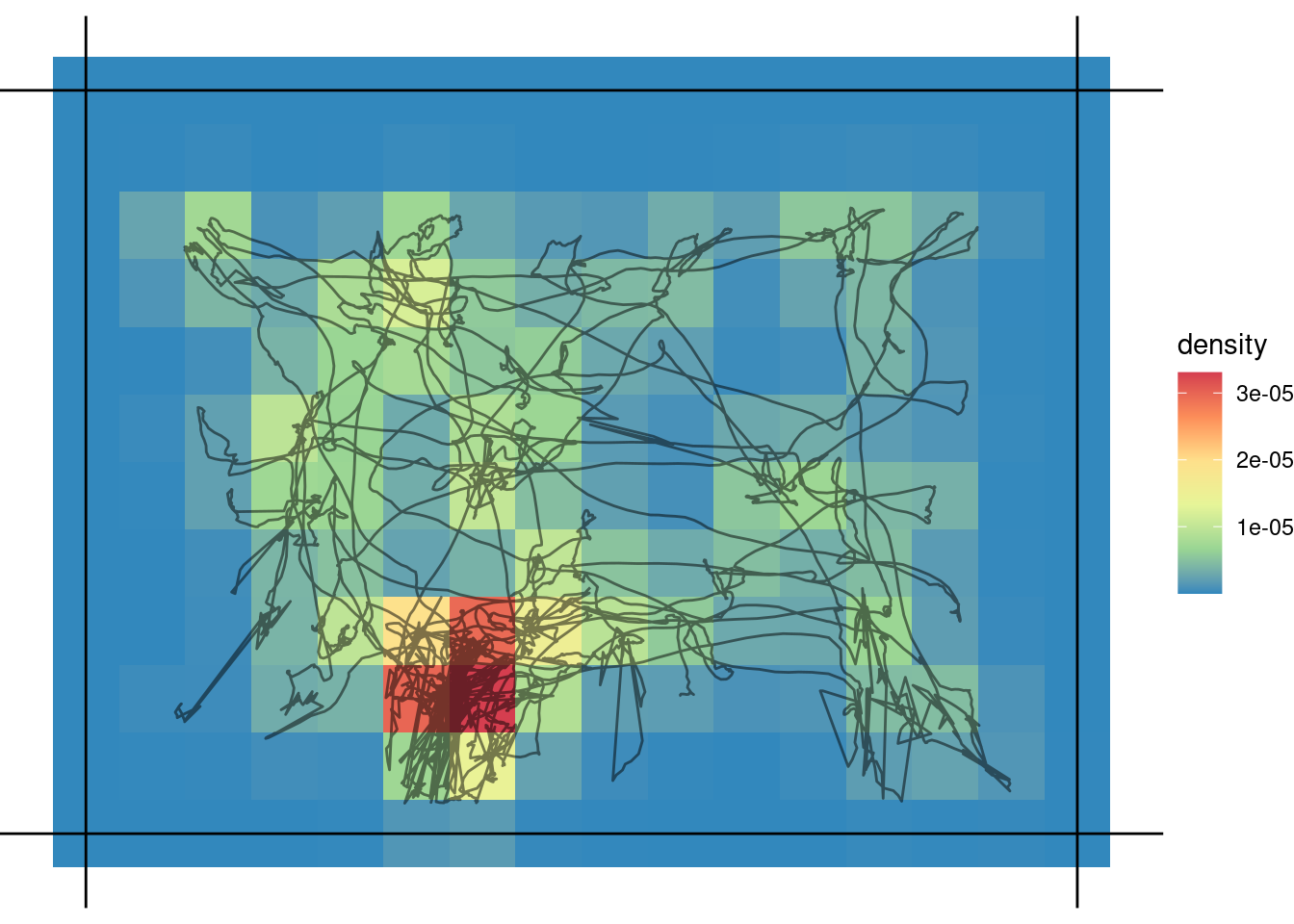 suppressPackageStartupMessages(library(dplyr))I have been playing around with tracking software and the ways to visualize the position of an animal in an arena over time. Even with normal cameras (30 Hz) and relatively small periods of time (~5 min) we get massive datasets and the only way to make sense of them is to aggregate data over time. I have been interested in neat visualizations (using R), thus here are some ways/comments. I will explore different packages and doing comparisons of the results.